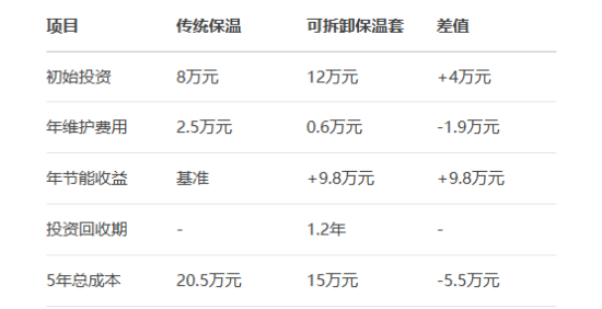 數(shù)據(jù)表明,雖然初始投資高50%,但可拆卸方案可在14個月內(nèi)通過節(jié)能收益收回差價。